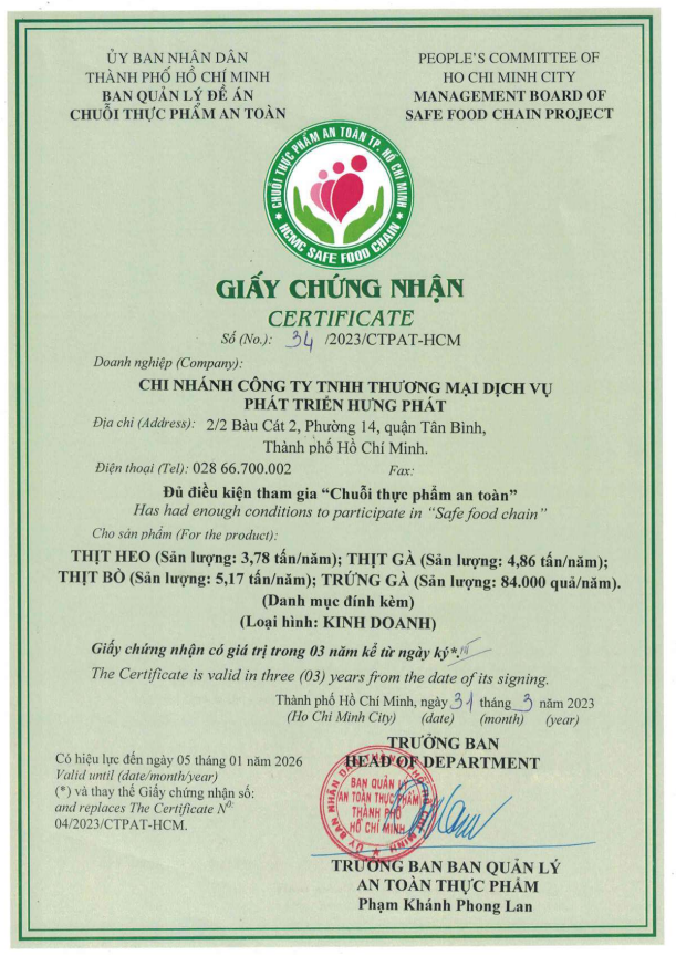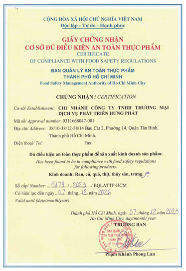 Các sản phẩm công ty Gold Food cung cấp đều lấy từ các nguồn thực phẩm an toàn, đảm bảo sức khỏe người tiêu dùng. Vì sức khỏe của người Việt và sự bền vững dài lâu trong kinh doanh, công ty Hưng Phát đặt chữ Tâm lên hàng đầu, làm điểm chính cho tầm nhìn kinh doanh của công ty.